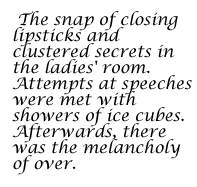 and clustered secrets in the ladies' room. Attempts at speeches were met with